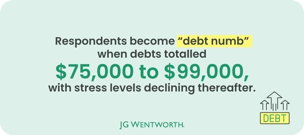 - Americans become “debt numb” when debts total $75,000 to $99,000, with stress levels peaking at an average of 4.2 out of 5.