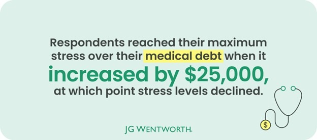 Four of the seven debt types showed a plateau in stress levels: credit card, medical, mortgage, and personal debts. Medical debt was the debt type that plateaued soonest at 3.1 out of five when debts increased by $20,000.