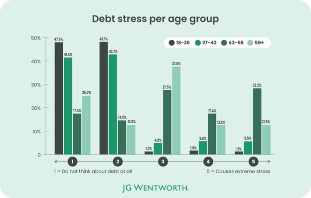- Nearly half, (48.1%) of 18-26 year-olds have a stress level of 2 regarding their current debts – the age group least worried about their debts.